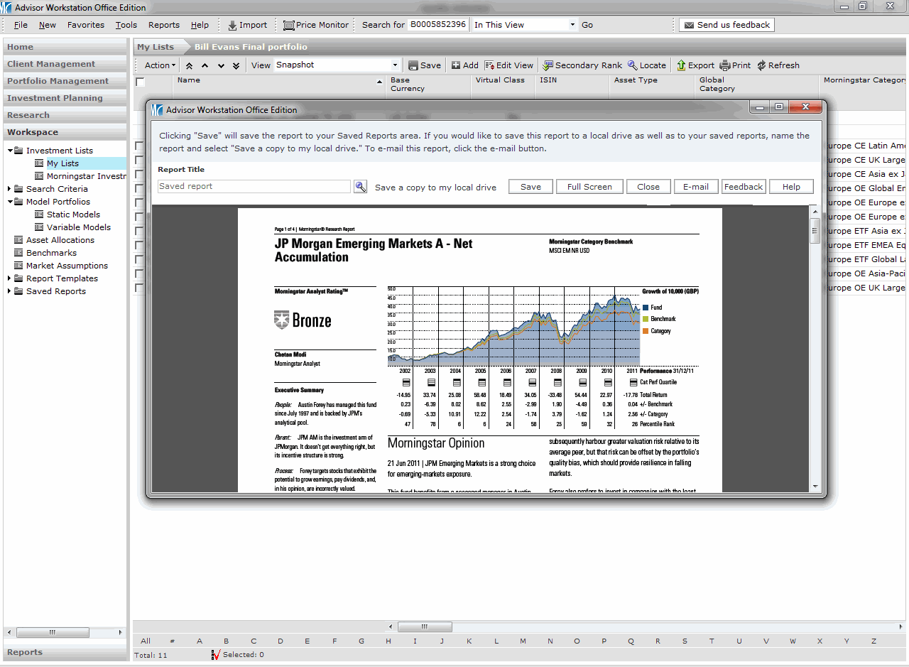 If you ever need to gather fund fact sheets, annual reports or fund prospectuses from the websites of asset managers, you can now gather these documents in Adviser Workstation. In the Research area, just select the fund for which you need the fact sheet/annual report/prospectus and click on the Action button. Then click on “Document Library.” This will give you PDF versions of the latest documents Morningstar has collected from the asset manager.