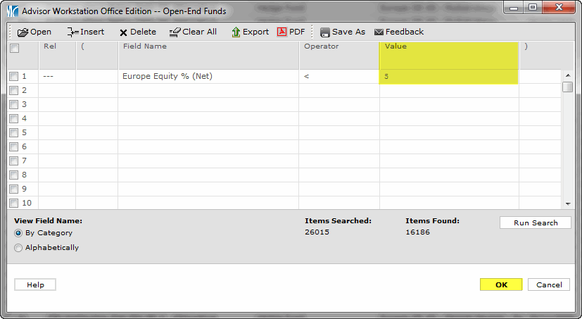 With our practice, we then turned these equations into search criteria in the “Workspace” area of Workstation. Within this area of Workstation, select “New search” and choose the Universe (likely Open-End funds). One “search” could then be the following criteria as an example: