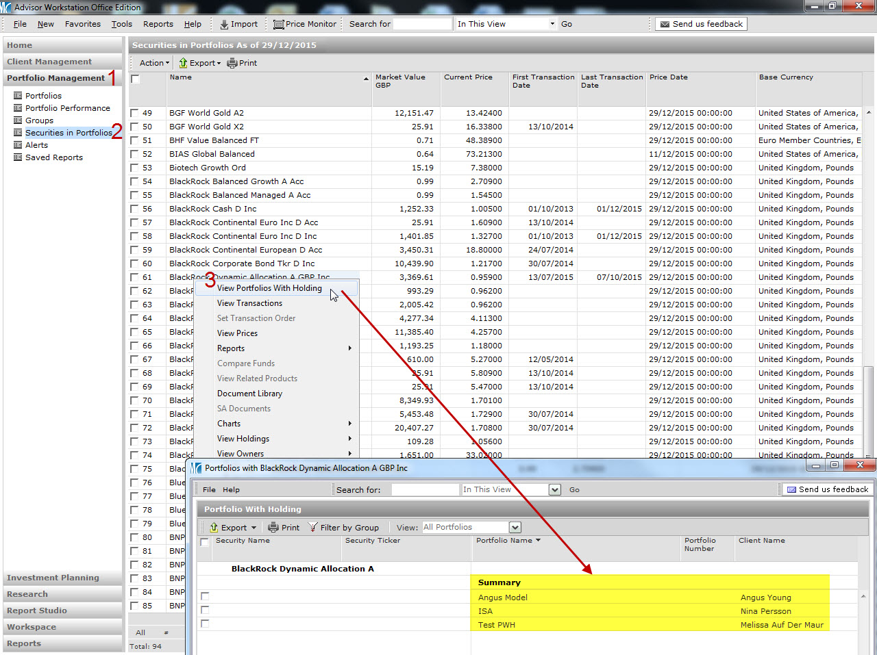 Click on “Portfolio Management” then “Securities in Portfolios”. To view which clients hold a certain security, check the box, click on “Action” then “View portfolios with holdings”.