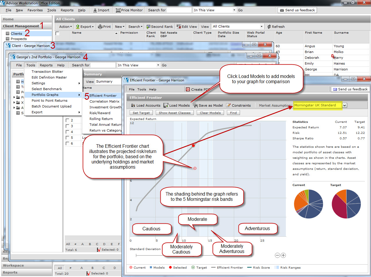 You can quickly assess the risk profile of a client’s portfolio by using the Efficient Frontier graph. Include model portfolios and back up your investment recommendation with a report highlighting the projected risk/return of each.