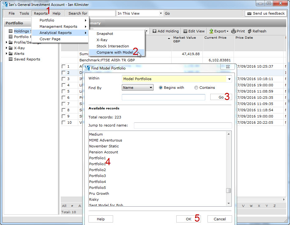 In order to run such a report, open a client’s portfolio and go to Reports > Analytical Reports > Compare with Model as illustrated in this screen print.