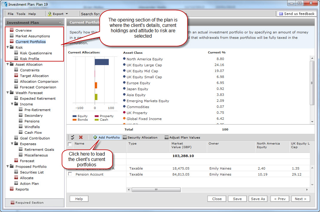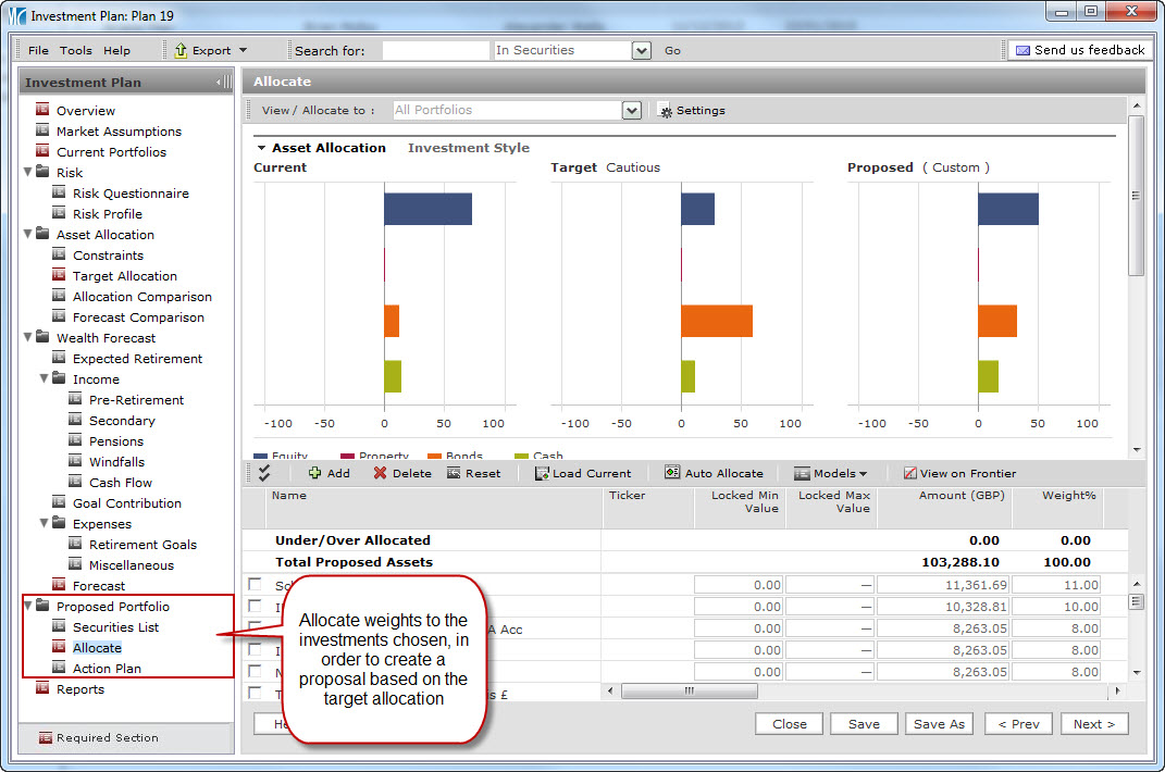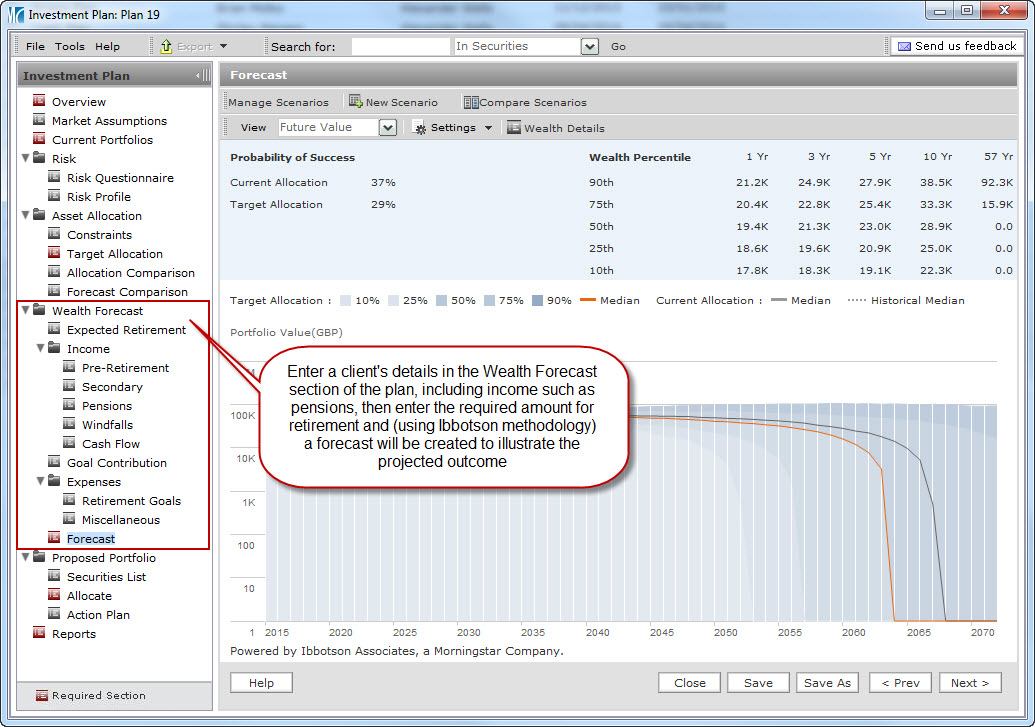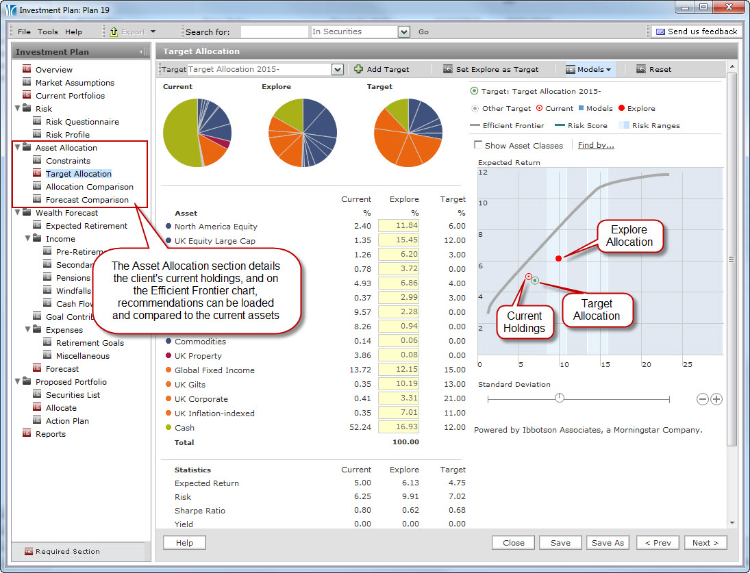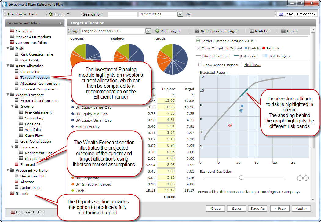 The investment planning feature of Adviser Workstation offers an easy and effective way to develop appropriate portfolios and present them to clients. Combining Ibbotson’s capital market assumptions with Morningstar’s easy-to-use interface, this integrated system helps identify and test target allocations, present recommendations, and implement portfolio changes.
