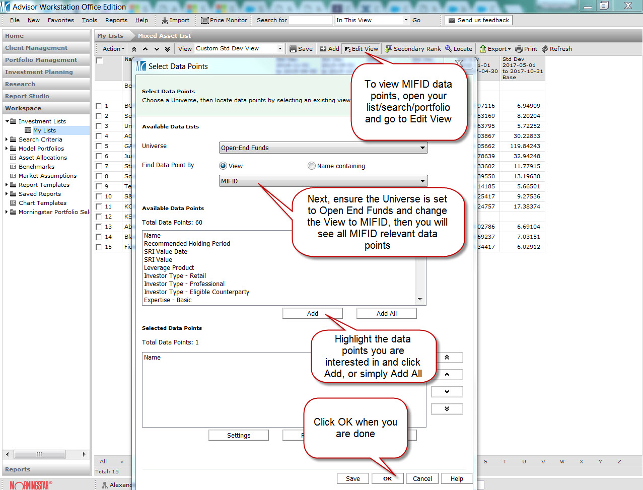 In late 2017 we added new data points within Adviser Workstation to cover the upcoming MIFID II regulations. Please click the image below to see how you can load this data for your existing list, search or portfolio.