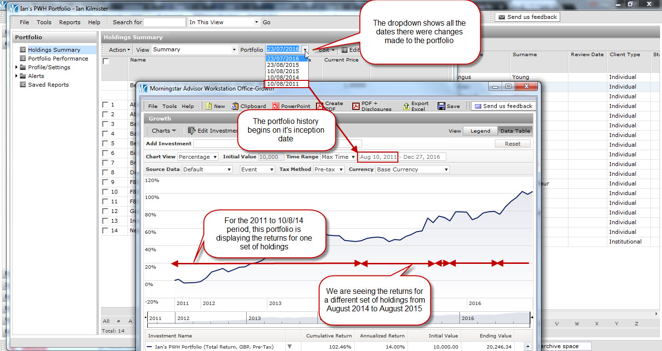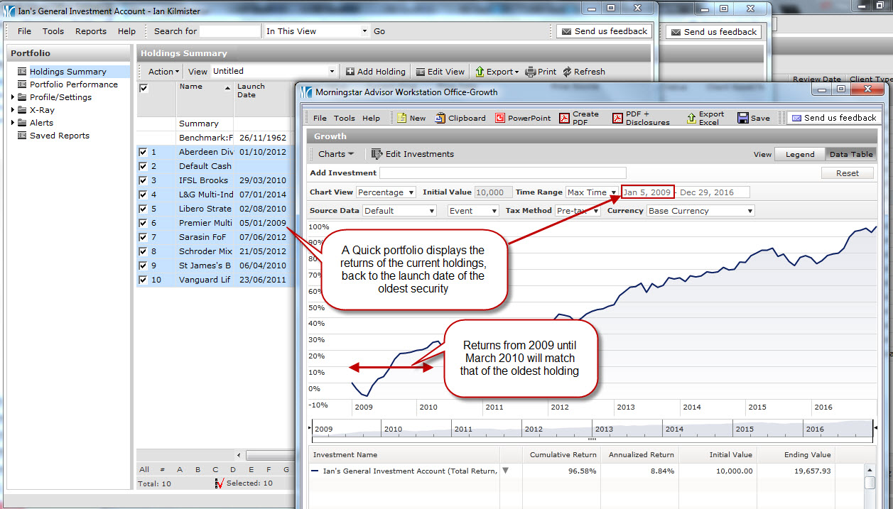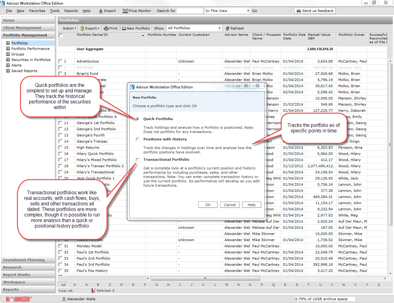 There are three types of client portfolio in Morningstar Adviser Workstation, Quick, Positions with History and Transactional.
