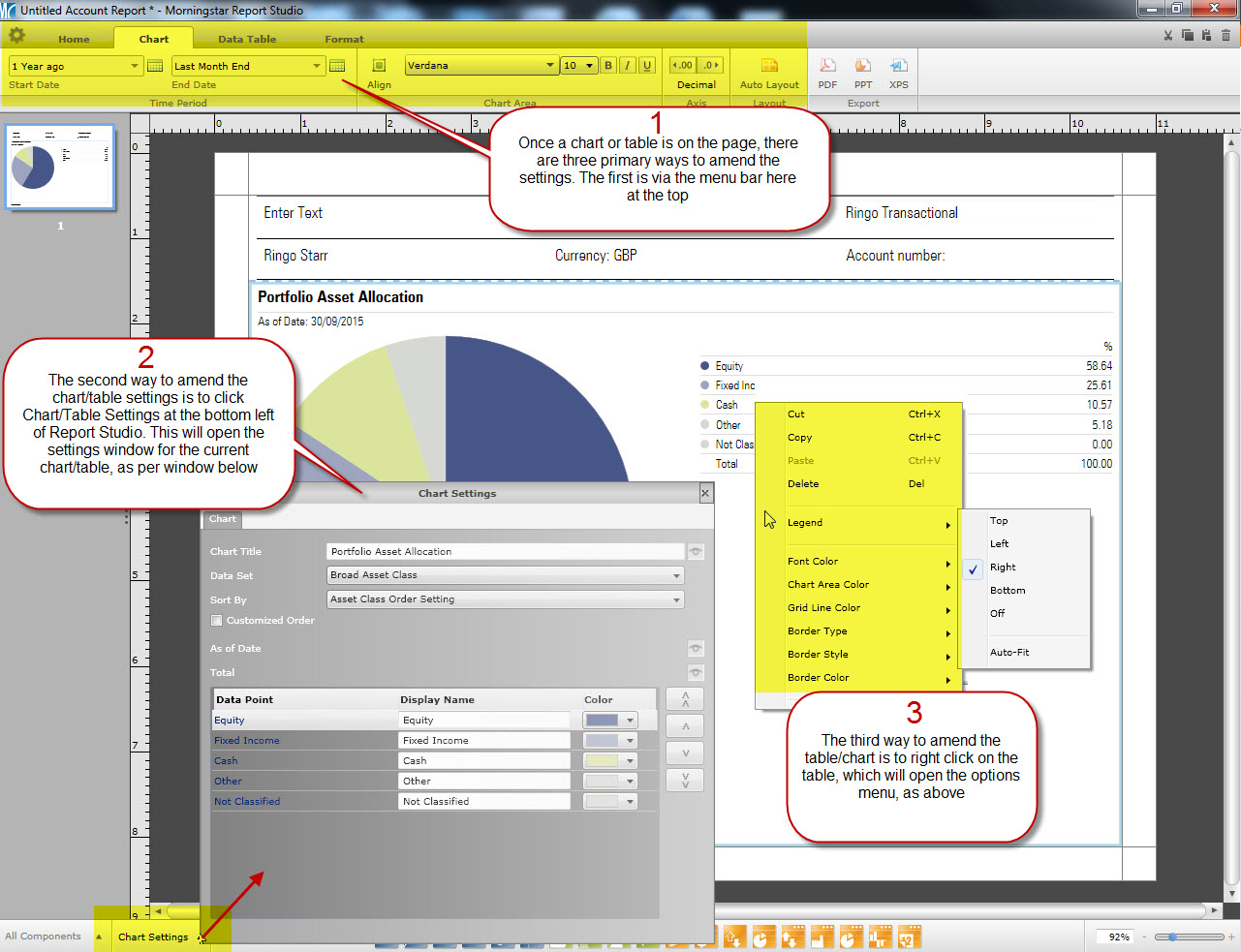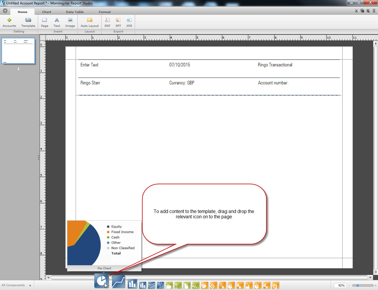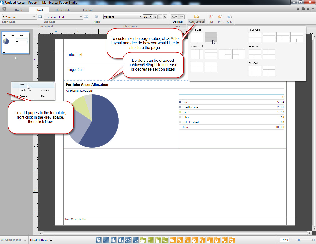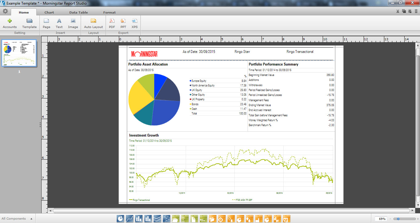 You can start with one of Morningstar’s pre-built templates or build a new report from scratch. Report creation couldn’t be simpler—a “drag and drop” interface makes it easy to select and position the elements on the report page and you can specify a portrait or landscape layout. Colourful and informative charts can be previewed by rolling over the icons at the bottom of the report building screen. To select a chart, just drag the icon onto the page. All elements within Report Studio automatically resize to fit the available space and page components immediately populate with current data every time you open the template. You can also edit chart titles, time periods, benchmarks, and more. Report Studio even provides the option to present data in the currency of your choice.