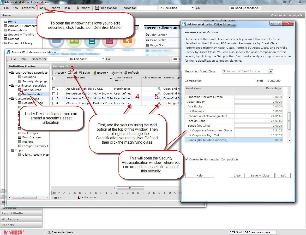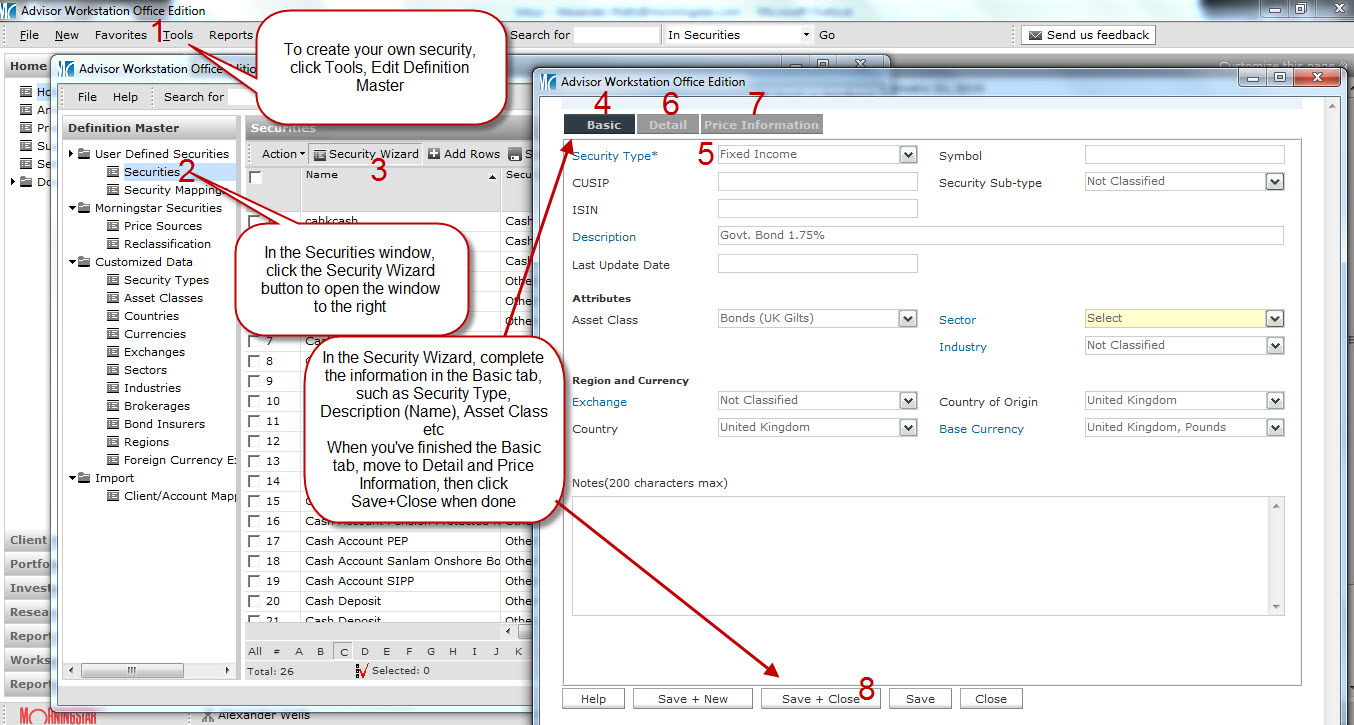 Morningstar Adviser Workstation contains detailed information on thousands of securities including (but not limited to) equities, bonds, open end funds and indices, though it’s possible to include securities of your own creation, as well as additional currencies, asset classes and more, and amend the settings on these as necessary.
