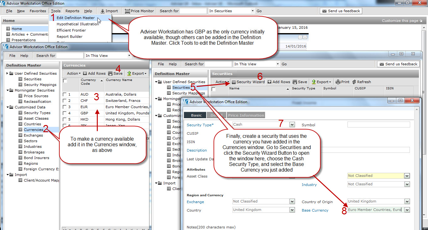 There are dozens of currencies available to use in Adviser Workstation, though you will need to add one to your account prior to using it in your own user-defined security.